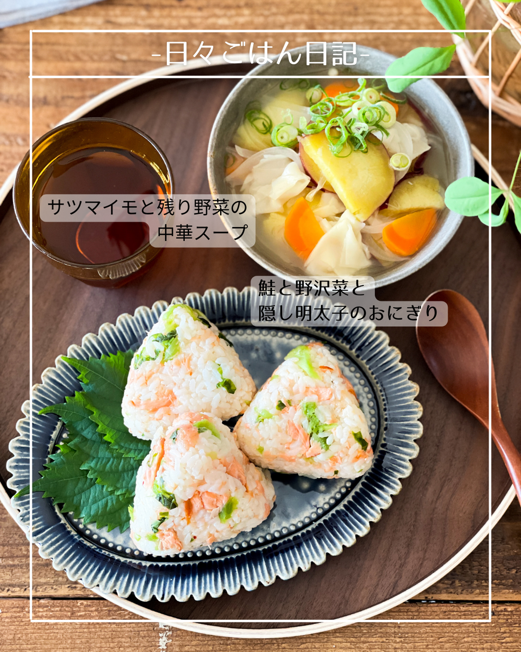 献立鮭と野沢菜と隠し明太子のおにぎりサツマイモと残り野菜の中華スープ: 簡単!節約!おしゃレシピ 〜SHIMAのオウチカフェ〜Powered by ライブドアブログ。