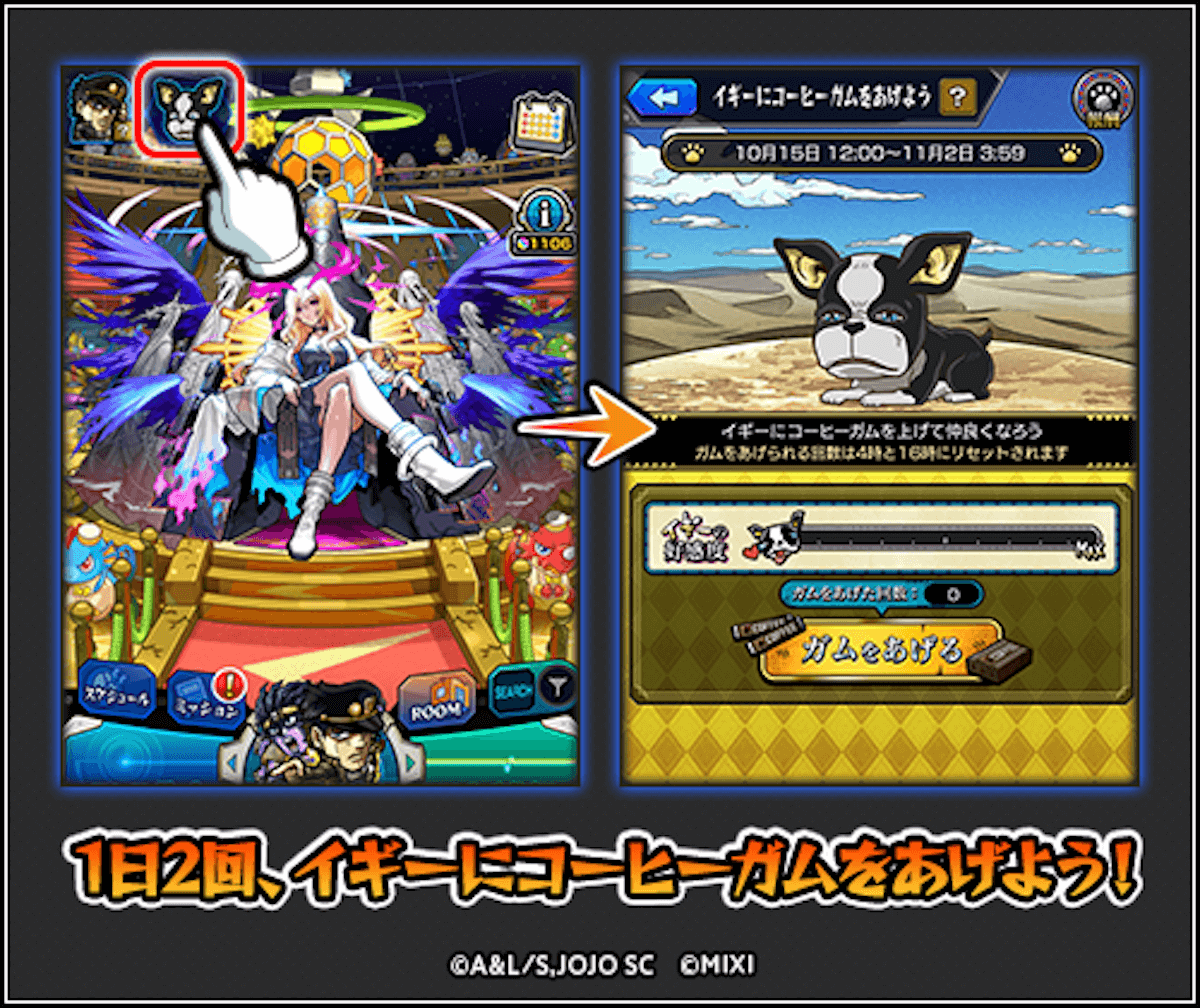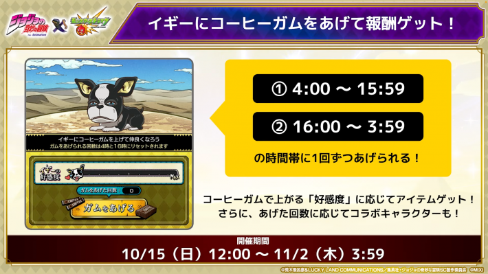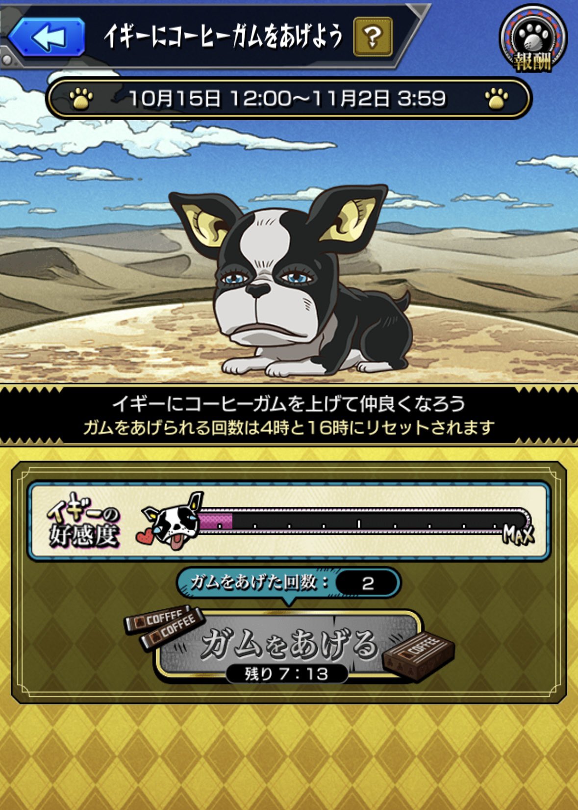 モンスト攻略班@AppMedia على X: "ジョジョコラボでは、イギーに毎日2回コーヒーガムをあげて、 「承太郎SC&イギー」やコネクトの書がもらえるみたいです👀モンストモンストニュース https:t.co 7vs3yG49LQ"X。