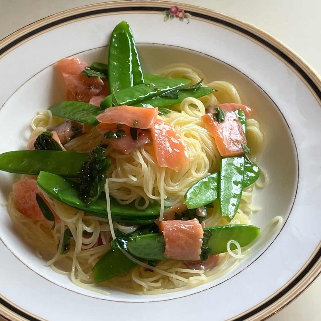 スモークサーモンとサヤエンドウの冷製パスタ レモンミントソースYukiの朝ごはん。