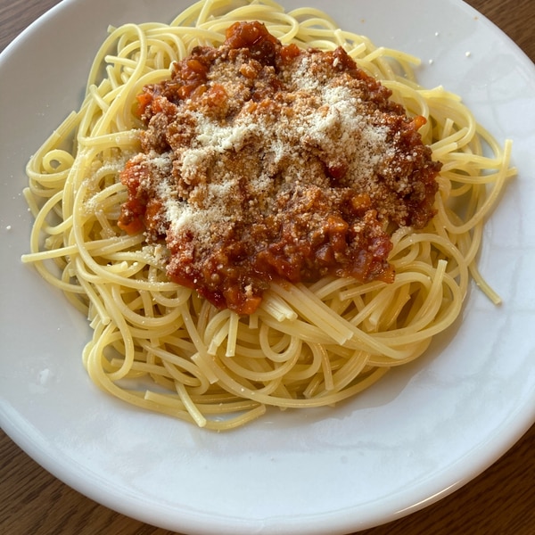 隠し味に醤油!トマトたっぷりミートソーススパゲティ。