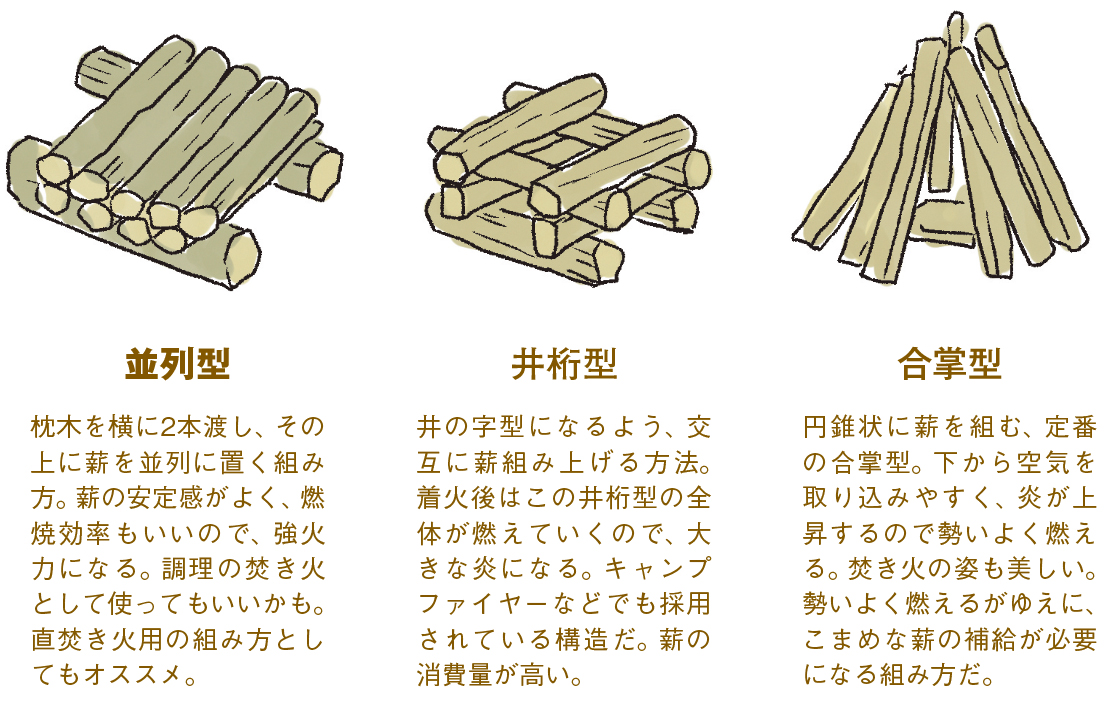 薪の組み方次第で長持ち度が変わる!?一番、薪が長持ちする組み方はどれ?焚き火のコツBE-PAL キャンプ、アウトドア、自然派生活の情報源ビーパル。
