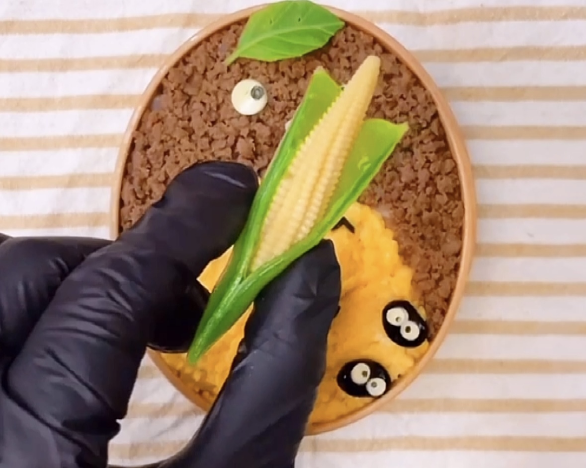 トトロ弁当そぼろ弁当 鶏そぼろと卵そぼろのモザイク弁当 ・ とうもろこし🌽はスナップエンドウとベビーコーン。チビトトロの葉っぱの傘もスナップエンドウだよ。 撮影後に気がついたけど、チビトトロの頭に鶏そぼろがひとつ乗っかってた💦 ・ トトロのお腹は。