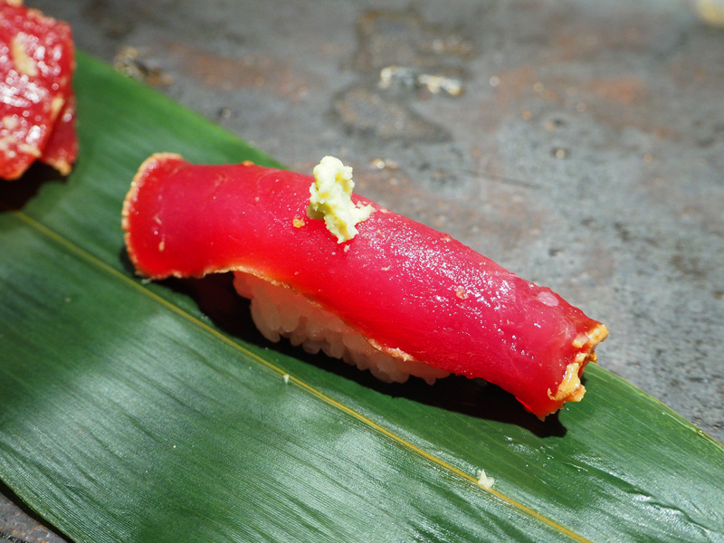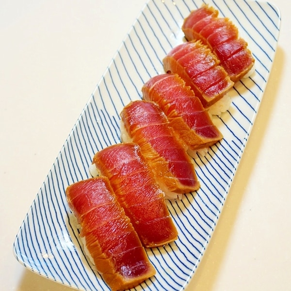 お寿司屋さん御免なさい!湯引き漬けマグロの握り寿司。