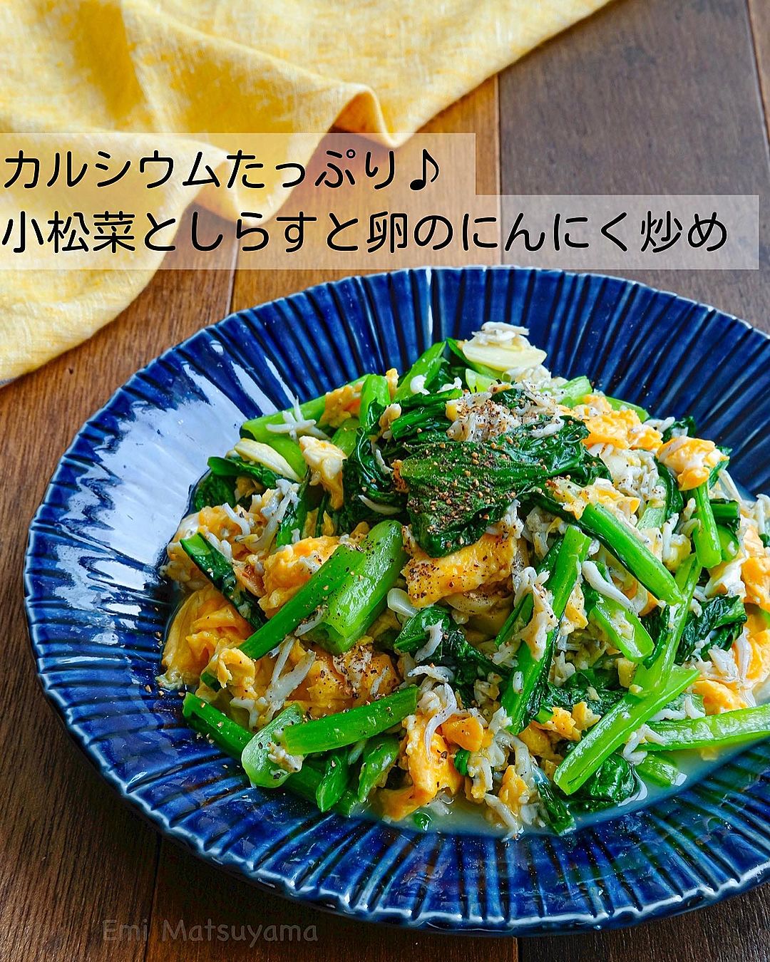 カルシウムたっぷり♪小松菜としらすと卵のにんにく炒め。