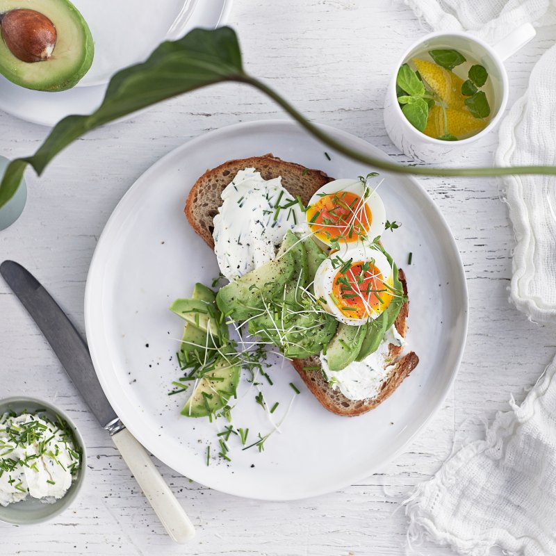TINE®クリームチーズ、卵、アボカドの田舎風パン。