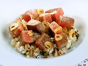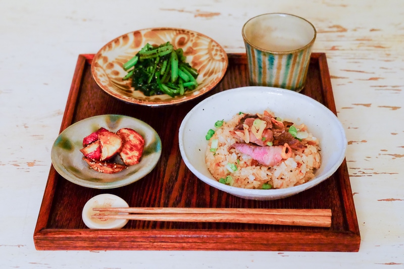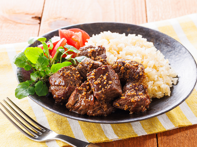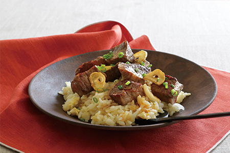 「コロコロステーキのガーリックライス」レシピ 渡辺麻紀さん。
