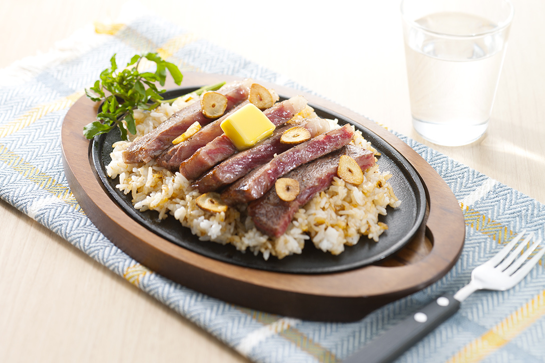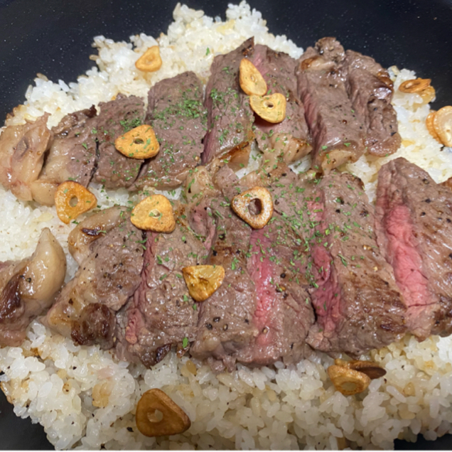 子どもも大人も喜ぶ ステーキのせ!ガーリックバターライス。