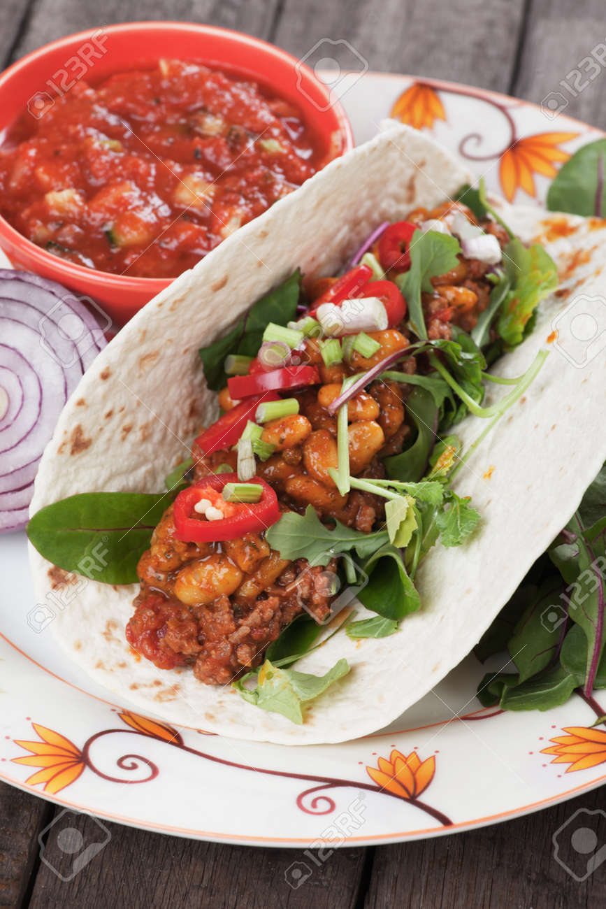 メキシコのトルティーヤ ラップ、唐辛子、豆と牛ひき肉のブリトーの写真素材・画像素材 Image 42272639。