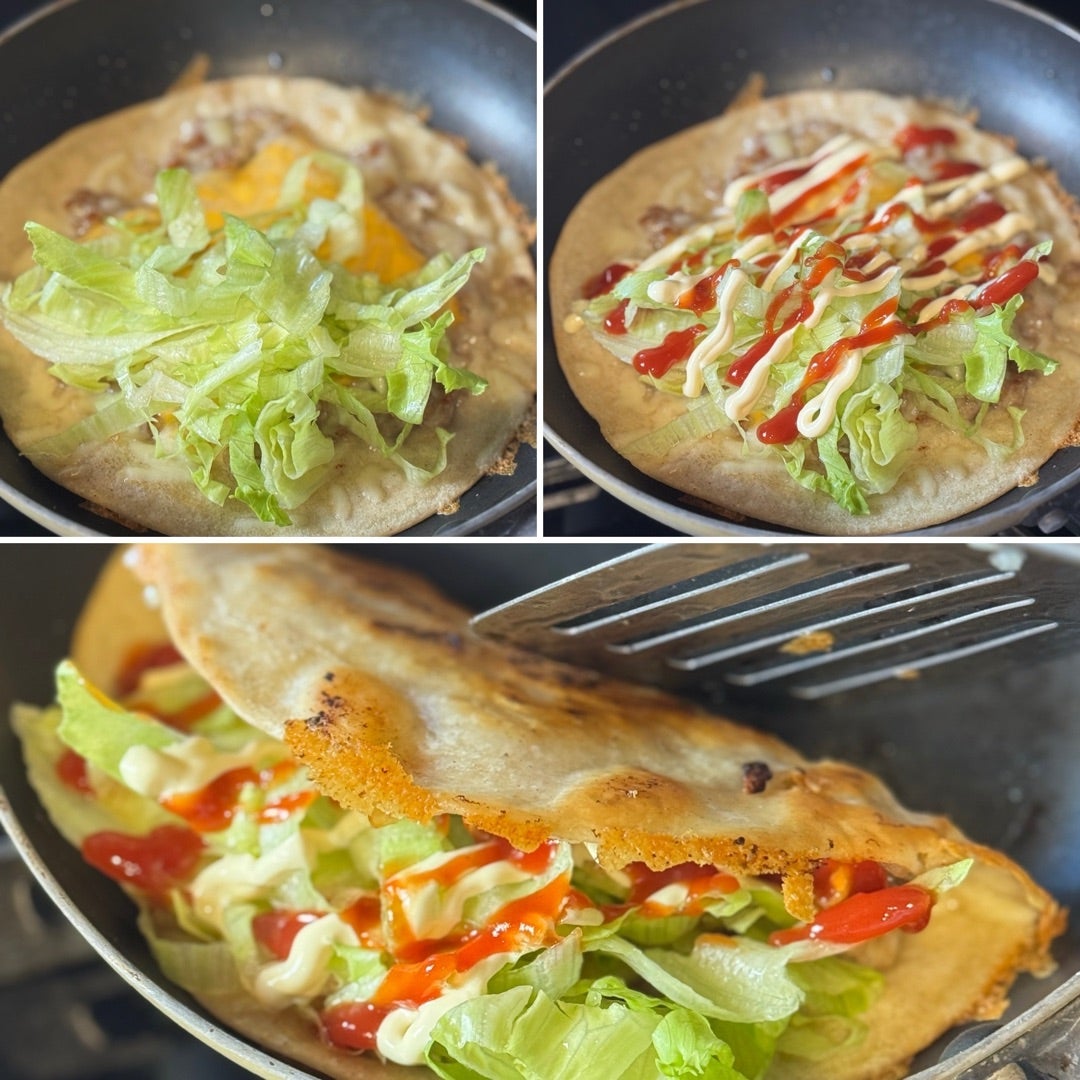 今夜はsnsで見たフライパン一つで作るトルティーヤレシピを参考に乾杯🌮, ✅トルティーヤ生地にひき肉のせる, ✅フライパンで肉の方から焼く🍳,✅ひっくり返しチーズのせて溶けたら好, 具材をのせ、, 熱々を巻いて食べる✨, 作る工程も楽しいし抜群に美味い😋, あ。, ひ、ひ、ひき肉です‼️,メキシコ,Mexico。