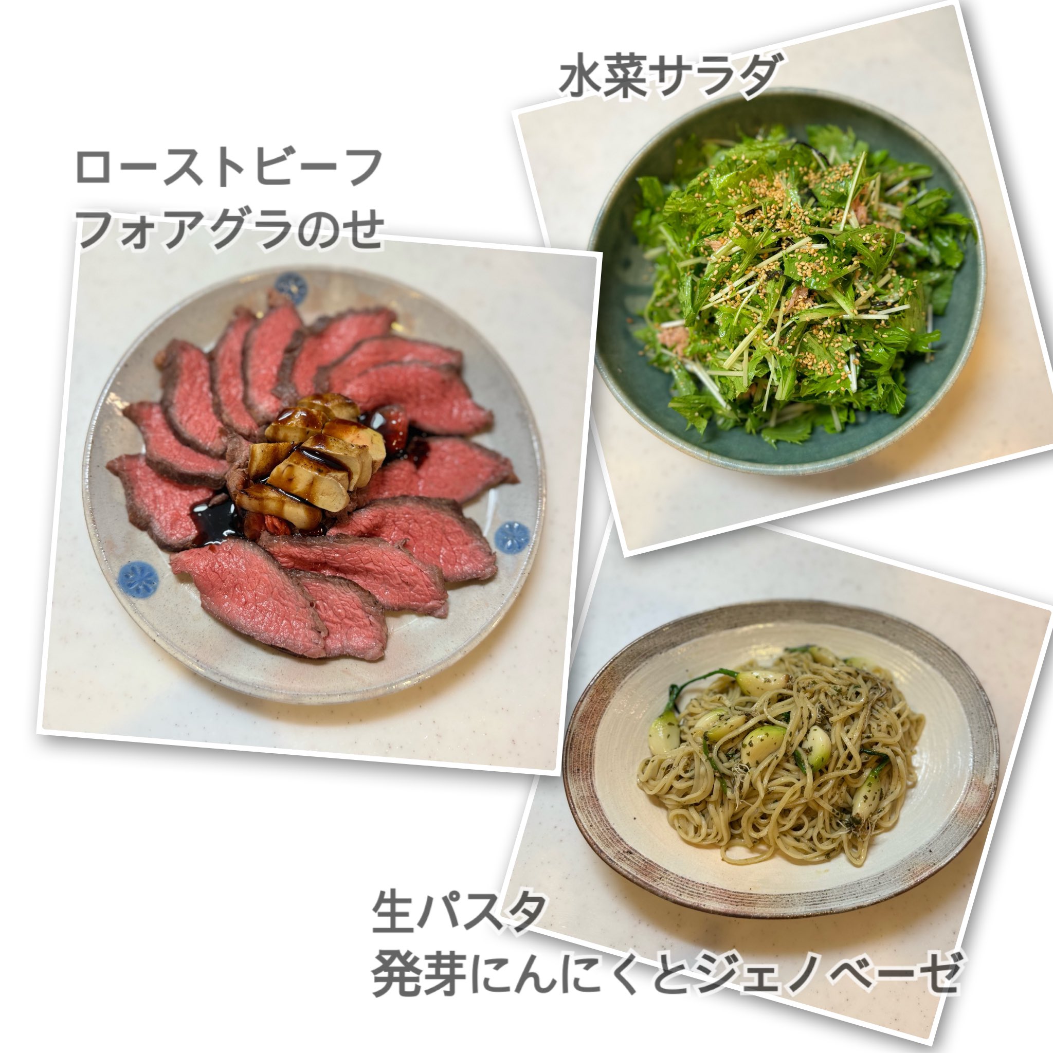 角煮 on X: "ローストビーフはフォアグラ付き😎 最近手に入りにくくなって残念だけどやっぱり美味しいフォアグラ大好き🥳水菜サラダはツナと塩昆布と胡麻油で。ローストビーフ低温調理フォアグラ水菜サラダ生パスタ発芽にんにくジェノベーゼおうちごはん。