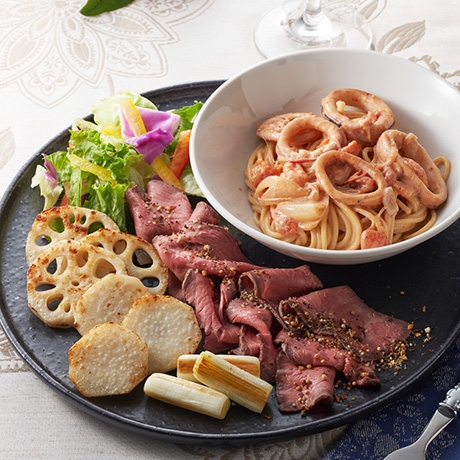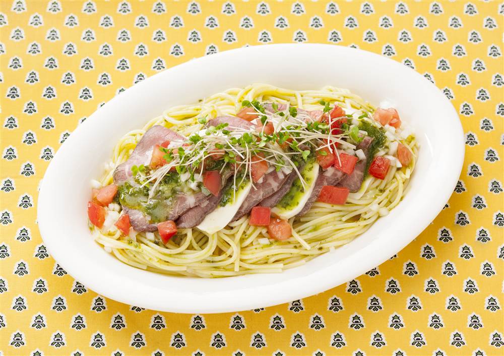 ローストビーフとモッツァレラチーズのバジルパスタ。