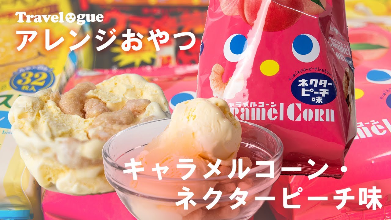 キャラメルコーン・ネクターピーチ味でアレンジおやつタイム!東ハトx不二家コラボの季節限定商品をアレンジレシピしてみたよ。後半には謎のアイスおにぎりも登場?4K東ハト。