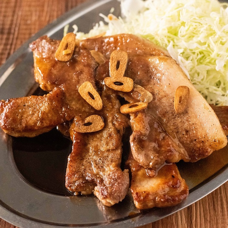ポークステーキ?トンテキ?何ていうんだろ? ガリバタ醤油に隠し味は中濃ソース 💖お酒やお砂糖が照りとトロミを作ってくれる。焼いた豚肉に絡めるだけ!フライパン一つで簡単調理🤗 ビフテキは焼き加減がストレスだったりするけどトンテキは、しっかり焼いちゃうからその。