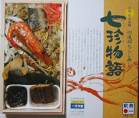 島根県松江駅前の和らくにて昼食。宍道湖七珍せいろめしを堪能。七珍とは、宍道湖 で採れる多彩な魚貝類の中からスズキ・シラウオ・コイ・ウナギ・モロゲエビ・アマサギ・シジミの7種類を選んだ伝統料理。7種類の食材それぞれに味付けがしてあって美味。最後は出汁茶漬け。