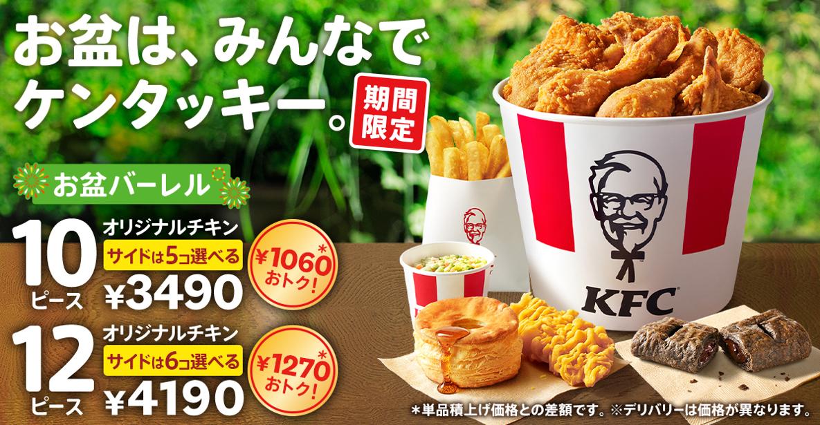 今年のお盆は、みんなでケンタッキー!KFC自慢の「オリジナルチキン」をたっぷり味わえる 最大1,270円おトクな「お盆バーレル」8月6日 水 から8月19日 火 の2週間限定で販売日本ケンタッキー・フライド・チキン株式会社 KENTUCKY FRIED CHICKENJAPAN,LTD。