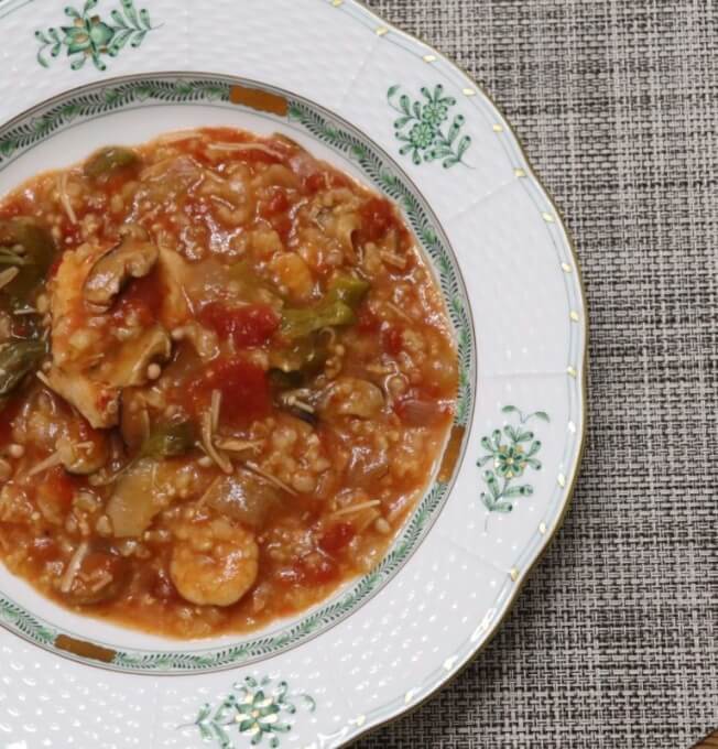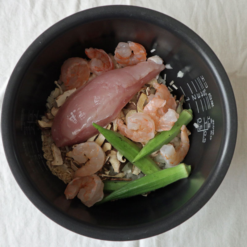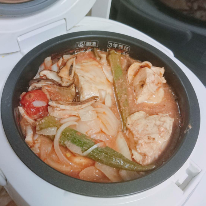 🌋🥘🎖✨ 究極の減量飯🏋🏼♂️ マッスルグリルさん考案「マグマ」アレンジ 本家では10合炊きでしたが、こちらは3合炊きのレシピになっています!材料 米 1合 にんにく 2片 玉ねぎ 半分 えのき 1 2袋オクラ 5個 カットトマト 500g 乾燥椎茸 4個 冷凍。