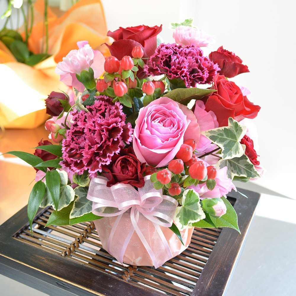 090 カーネーションの入ったピンク系アレンジメント 母の日におすすめ! お花 花 生花 花束 フラワーアレンジメント モダン 和風 バラ 薔薇ローズ ピンク 紫 お祝い 誕生日 結婚祝い 出産祝い ホワイトデー バレンタイン 父の日 母の日 敬老の日 記念日 結婚記念日。
