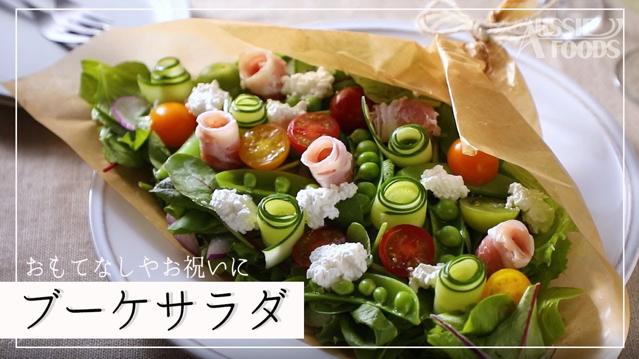 ブーケサラダの盛り付け方 生ハムときゅうりを巻いてお花に見せるサラダの花束。