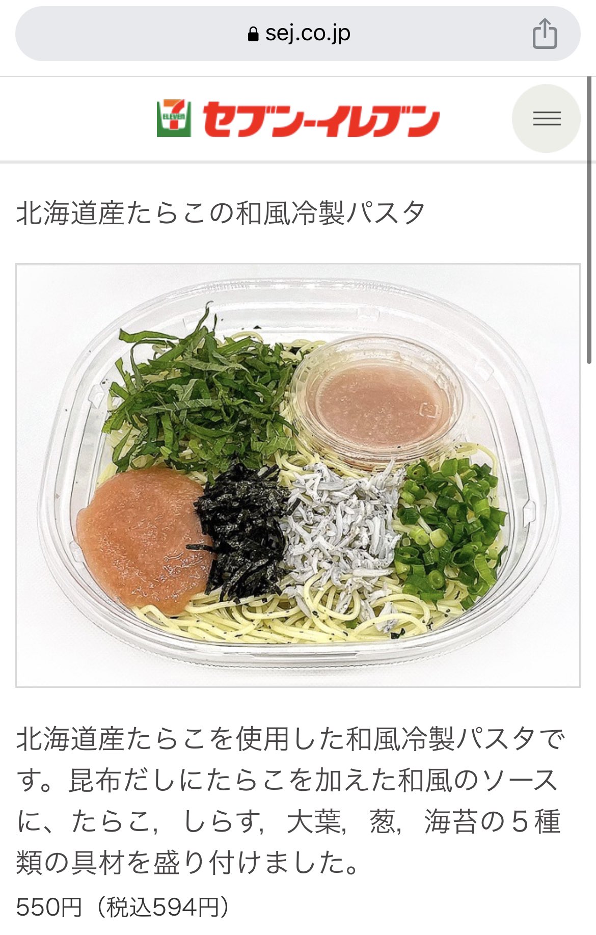 なちゅ。@発達親向けハック本出ました📗 on X: "セブンイレブンのこの「北海道産たらこの和風冷製パスタ」がたらこたっぷりでおいしくて、先週からヘビロテしてしまってる。今日は食べる前に写真を撮ってツイートしようと思ったのに、好きすぎてうっかり勢い余ってもう。