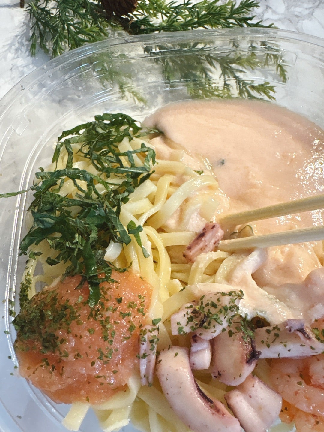 セブン、明太子と海老の冷製明太クリームパスタ実食レビュー!ひんやりクリーミー、明太感も強めですやさしい生活。