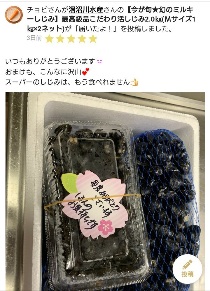 チョビ様からレビューをいただきました! スーパーのしじみはもう食べられません 涸沼しじみの問屋・直売所・直営店「 有 涸沼川水産」。