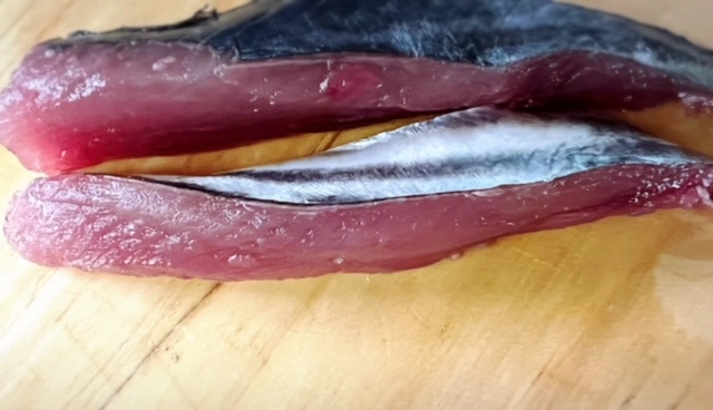 海上釣堀で釣果がアップする「カツオの切り身」の作り方。