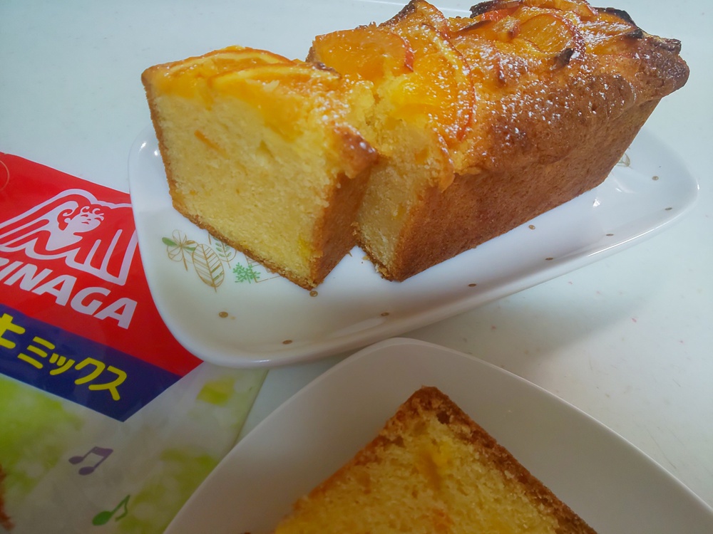 森永のホットケーキミックスを使ってオレンジのパウンドケーキを作りました。オレンジを皮つきのままスライスしてコンポートを作り、刻んだものを生地にスライスはトッピングに使い焼き上げました。コンポートにはレエンゼルPLUS by 森永製菓。