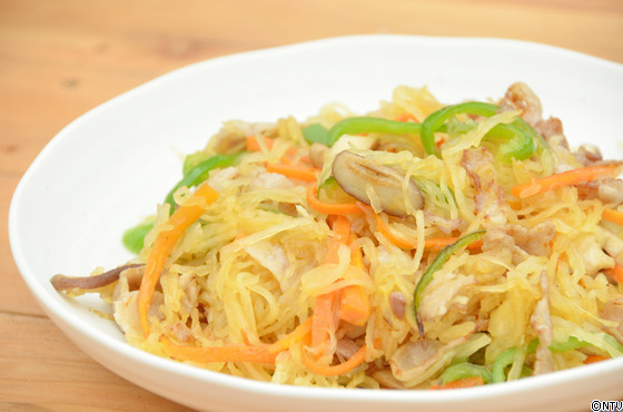 そうめんかぼちゃの激ウマレシピ「そうめんかぼちゃの鶏そぼろ餡かけ」。