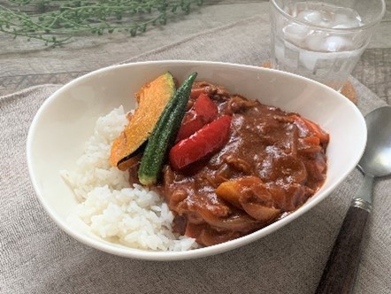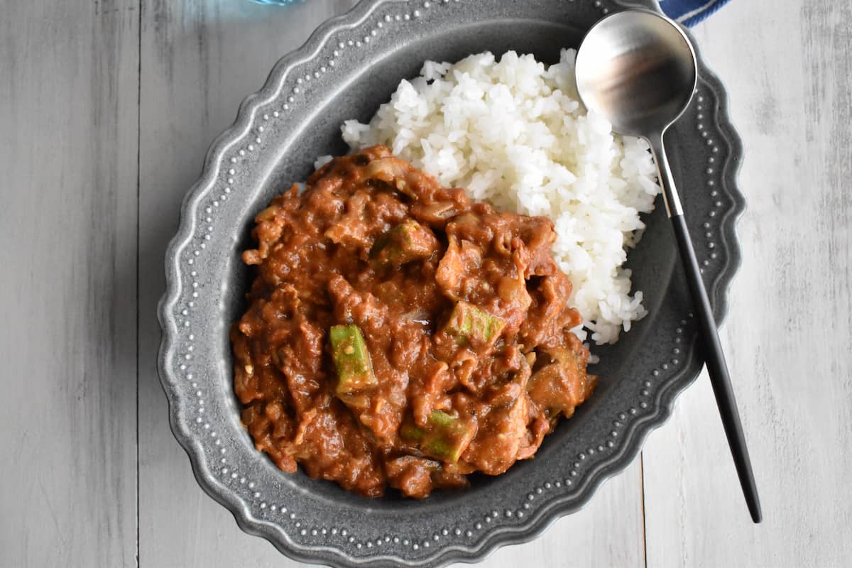 トマト缶と野菜の水分で作るから濃厚!「オクラとなすの豚こま無水カレー」レシピ。