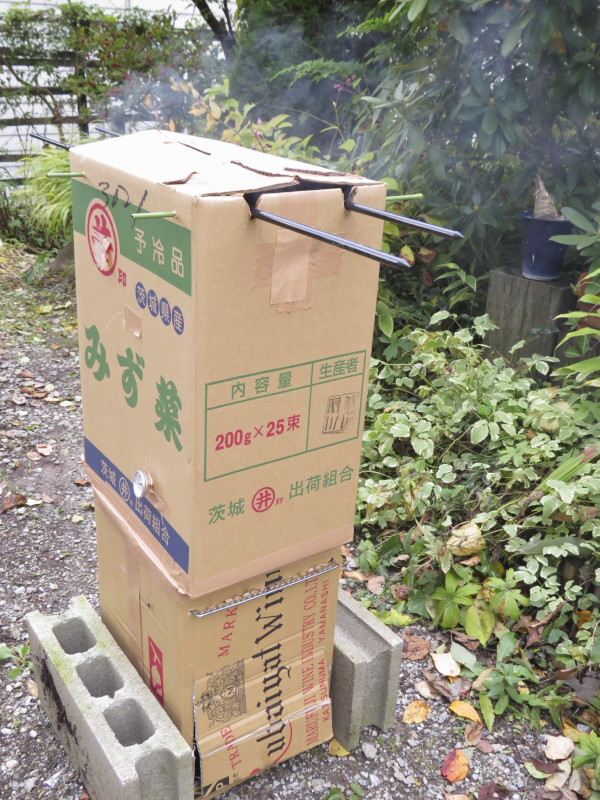 段ボール箱の燻製器、いざ点火!日日是好日 *゚✲*☆お庭と暦と時々料理*゚✲☆。