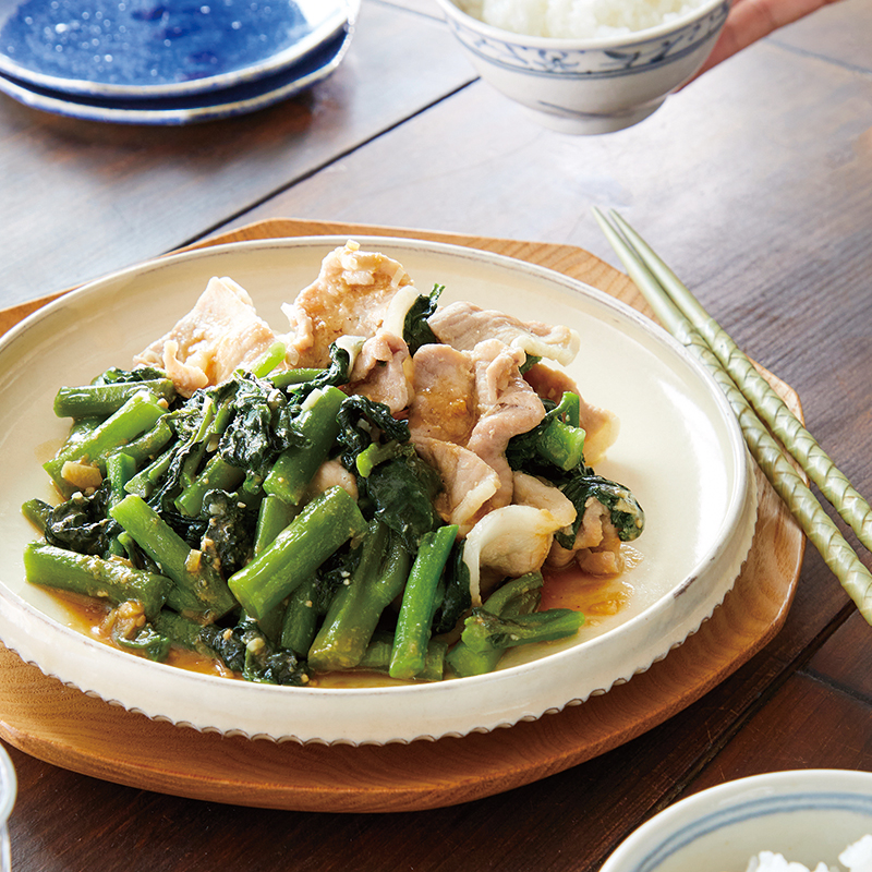 つるむらさきと豚肉のさっと炒めクッキングレシピよつ葉生協。