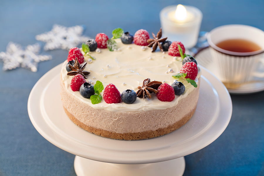お店のような仕上がり。ベリー飾りの濃厚レアチーズケーキ。
