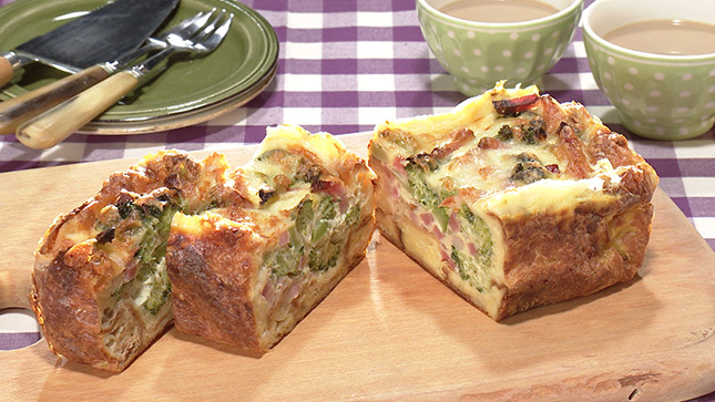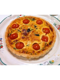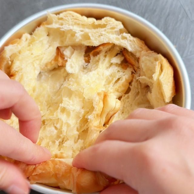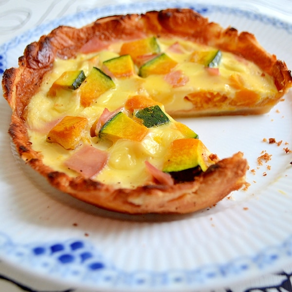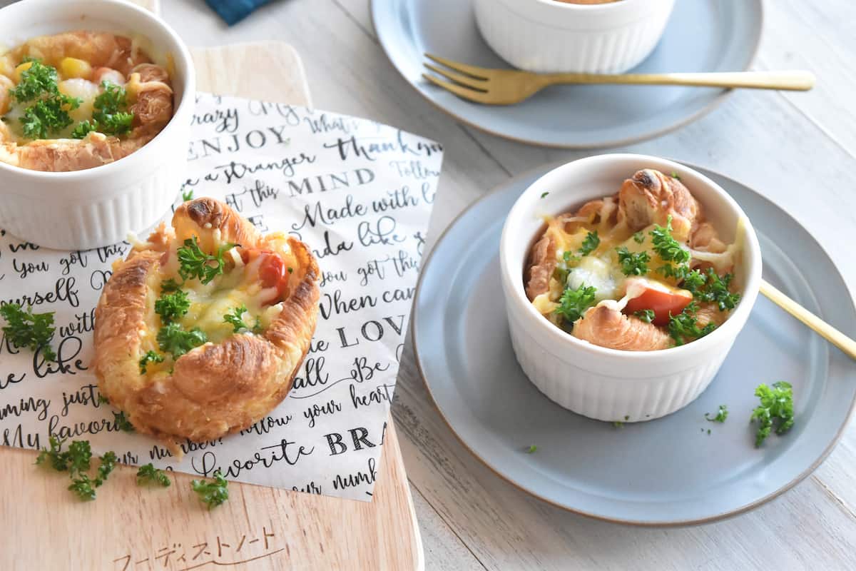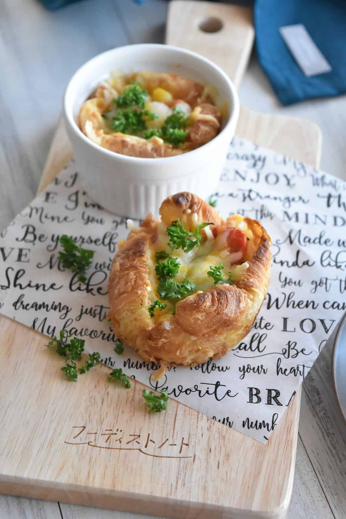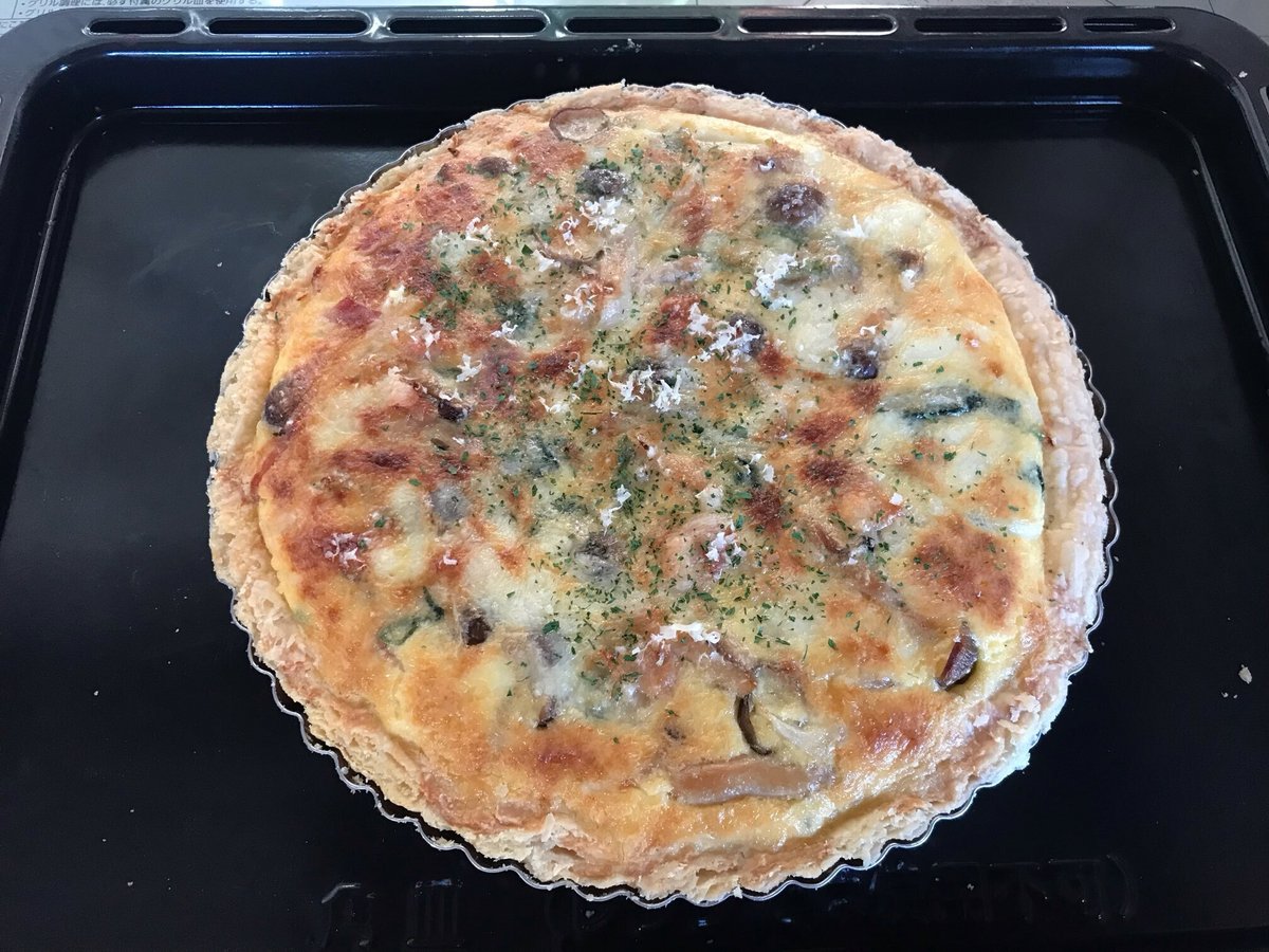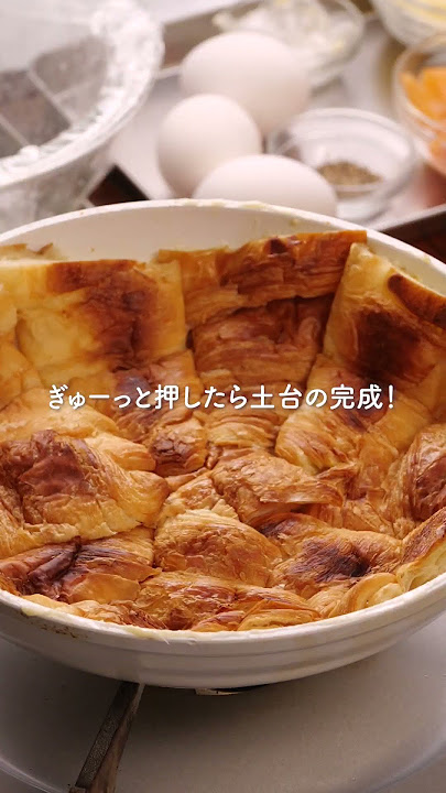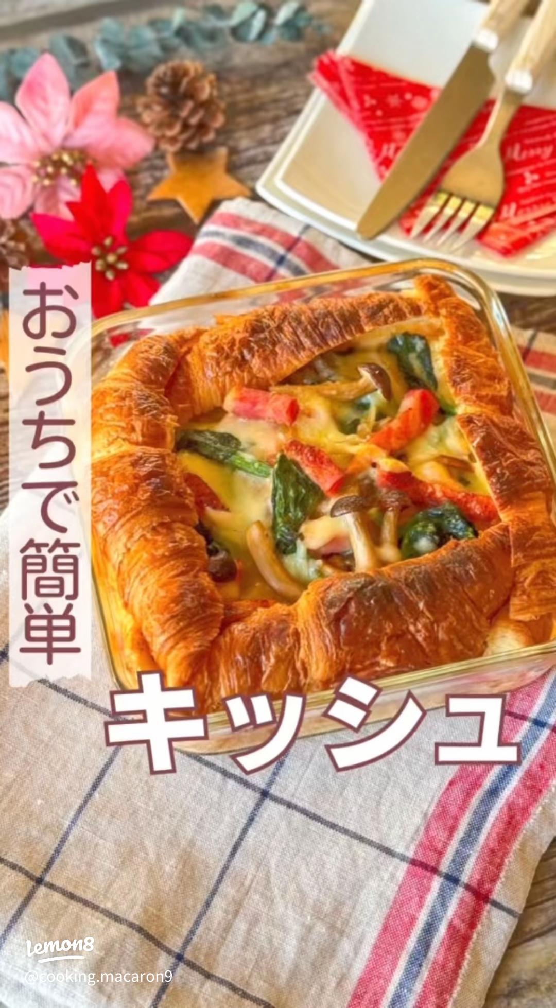 クロワッサンキッシュ1月30日 木 放送 近藤幸子先生 @oishisyumatsu バターをたっぷりと使ったサクサクのクロワッサンをキッシュの台にしました。炒めた具材を入れた卵液を流し、チーズをのせて焼き上げます。 クロワッサンに卵液を吸わせてから焼いて。 ☆材料 18。