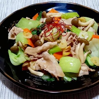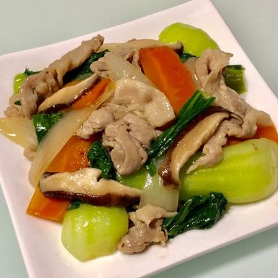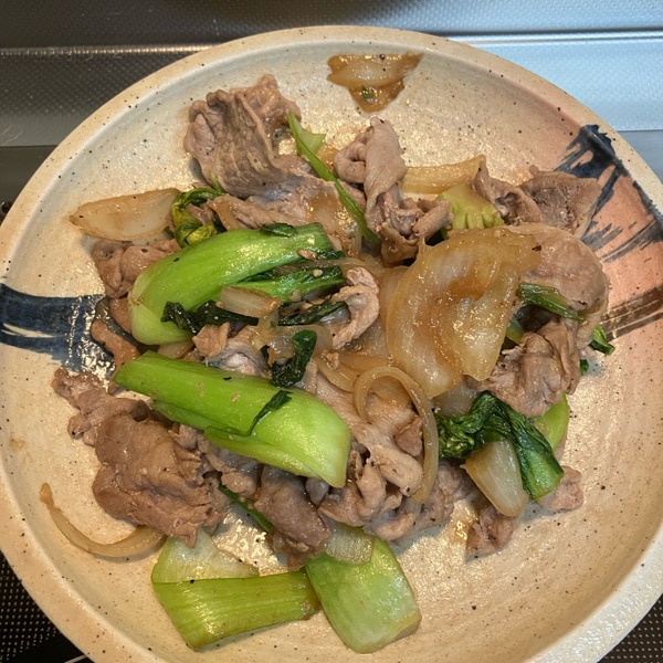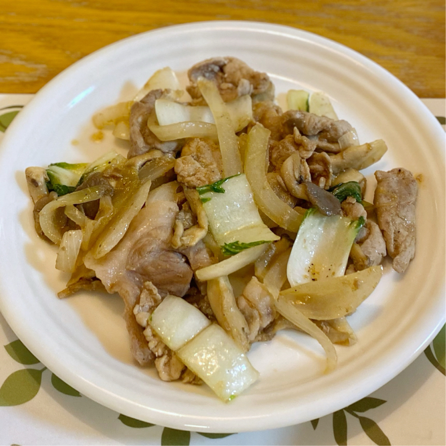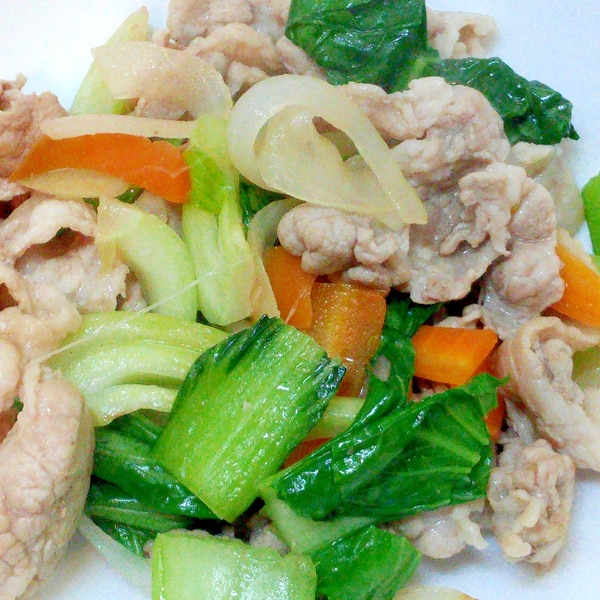 簡単♪チンゲン菜と玉ねぎとにんじんと豚肉の野菜炒め。