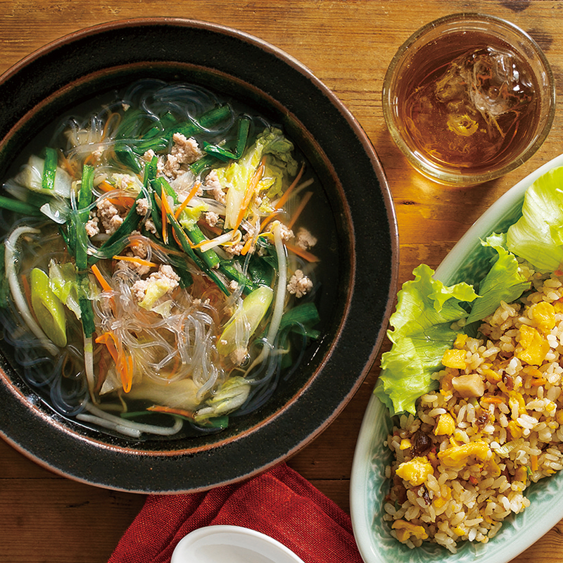 「たっぷり野菜と春雨の具沢山スープ」、チャーハン ちぎりレタス添え 2人分。