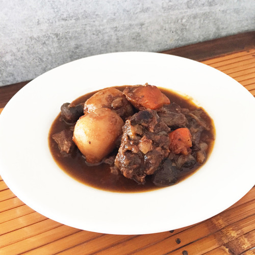 圧力鍋で 新じゃがと牛すね肉のあっさり赤ワイン煮。