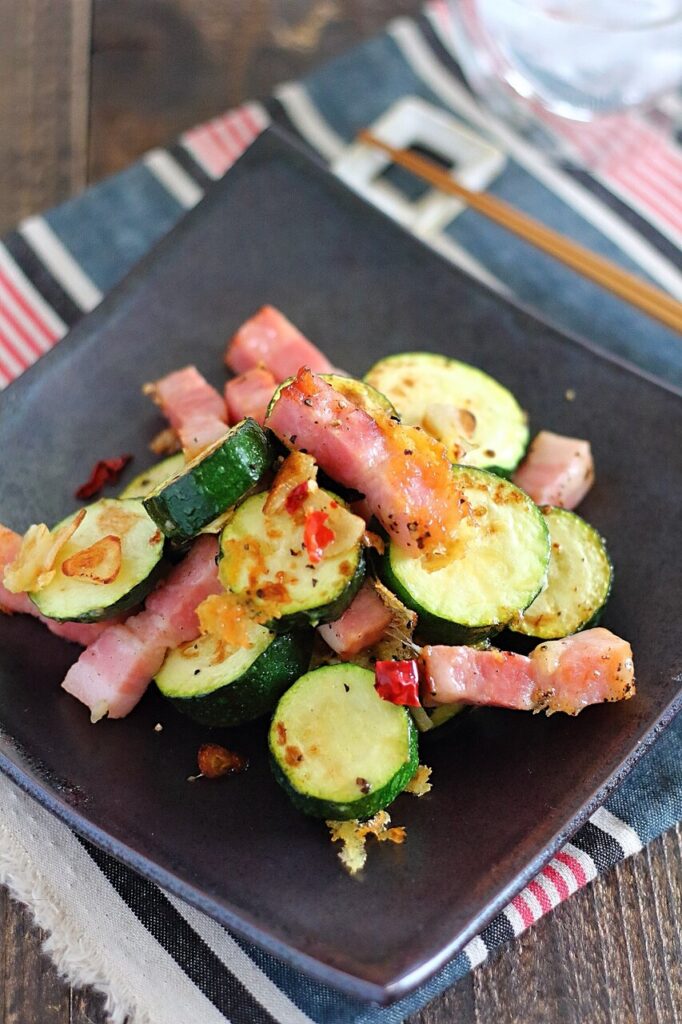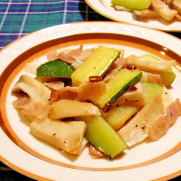 厚切りベーコンとズッキーニのペペロンチーノ風ボリューム満点!大満足な簡単おかず。