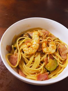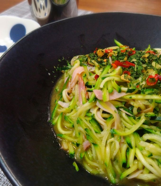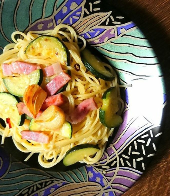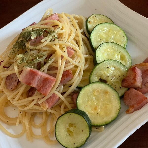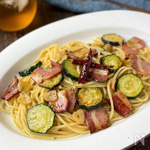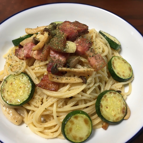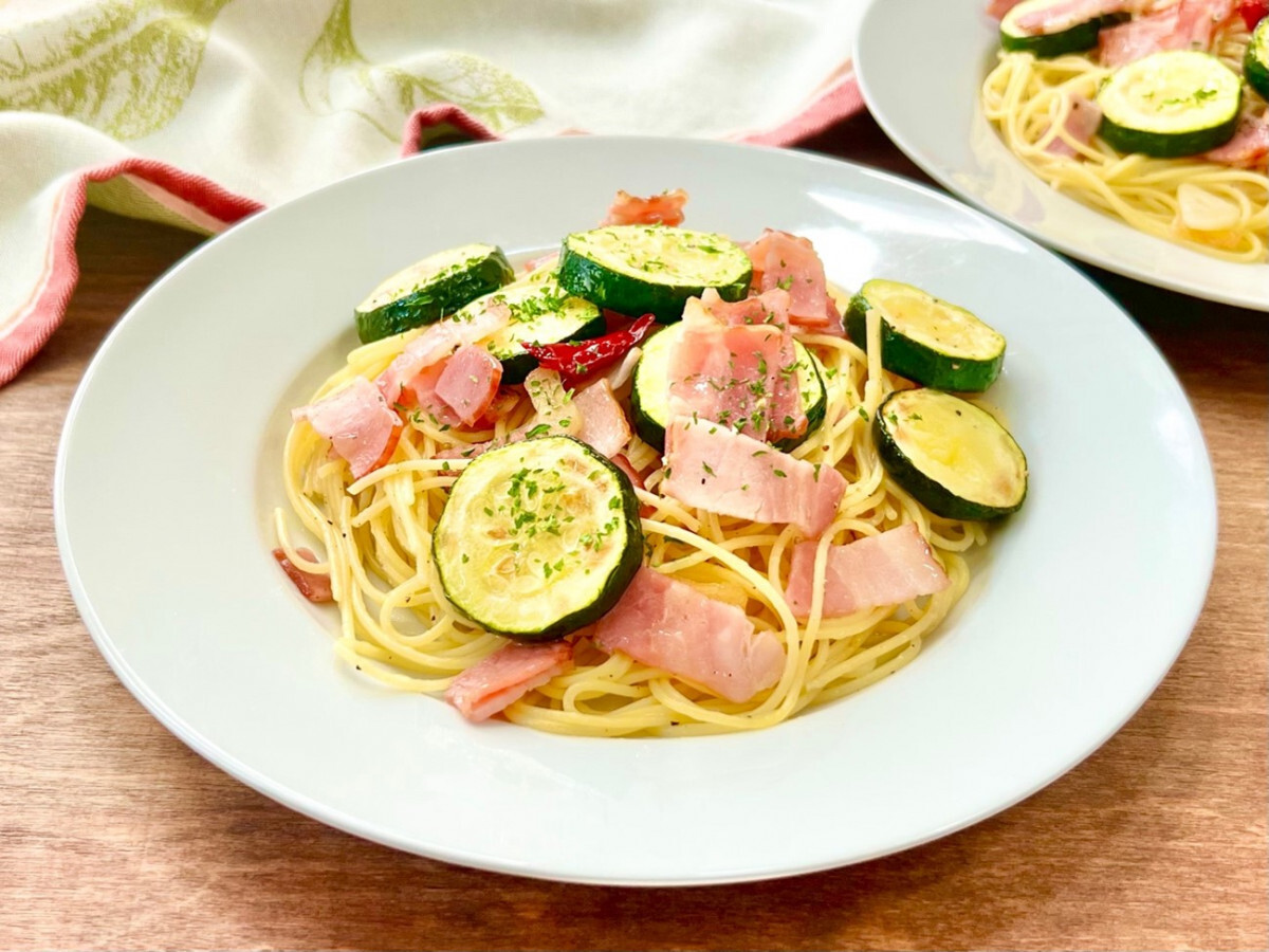 白だしで簡単!ズッキーニとベーコンの和風ペペロンチーノ。