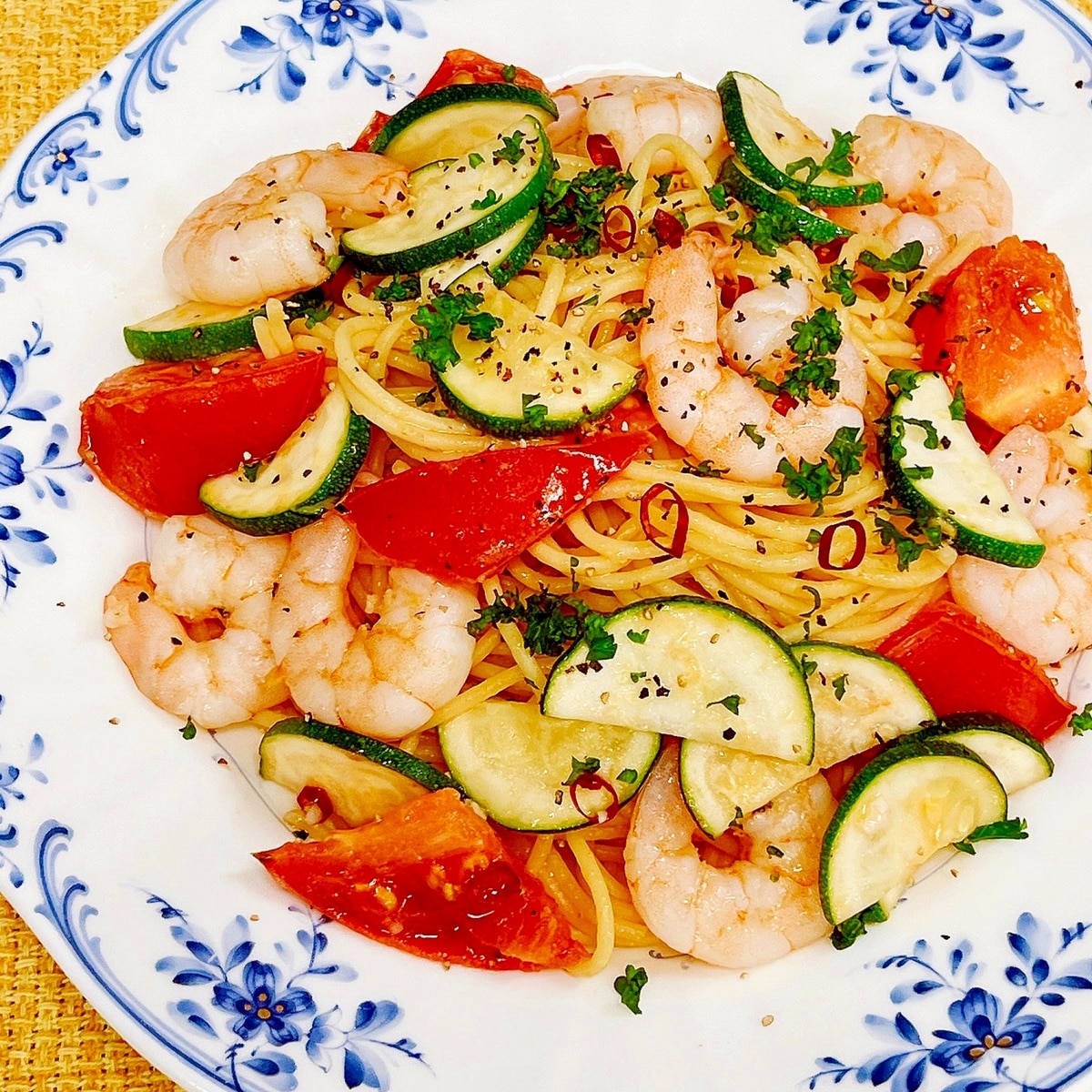 ズッキーニのペペロンチーノ ズッキーニの香ばしさとミニトマトの甘酸っぱさが絶妙。