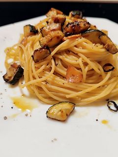 🌶️ 『ズッキーニとなめこのペペロンチーノ』 夏野菜が少しずつ顔を出し始めました。 まずはおなじみの 焼いてよし、茹でてよし、すぐに巨大化のズッキーニさんを使ったパスタです。 ズッキーニを玉ねぎとじっくり蒸し煮にして 旨味を引き出してからソースに。 具には。