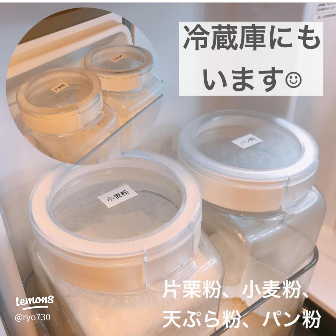 ひー\ 我が家の粉物収納・ 毎朝起きて一番に冷蔵庫から取り出すのが片栗粉か薄力粉毎朝のお弁当作りと夕飯には欠かせない片栗粉か薄力粉・ 今まで粉物類は小さい容器に入れて使っていたので 大きい容器に入れて冷蔵庫の一番上の段にズラーっと並べるのが憧れで。