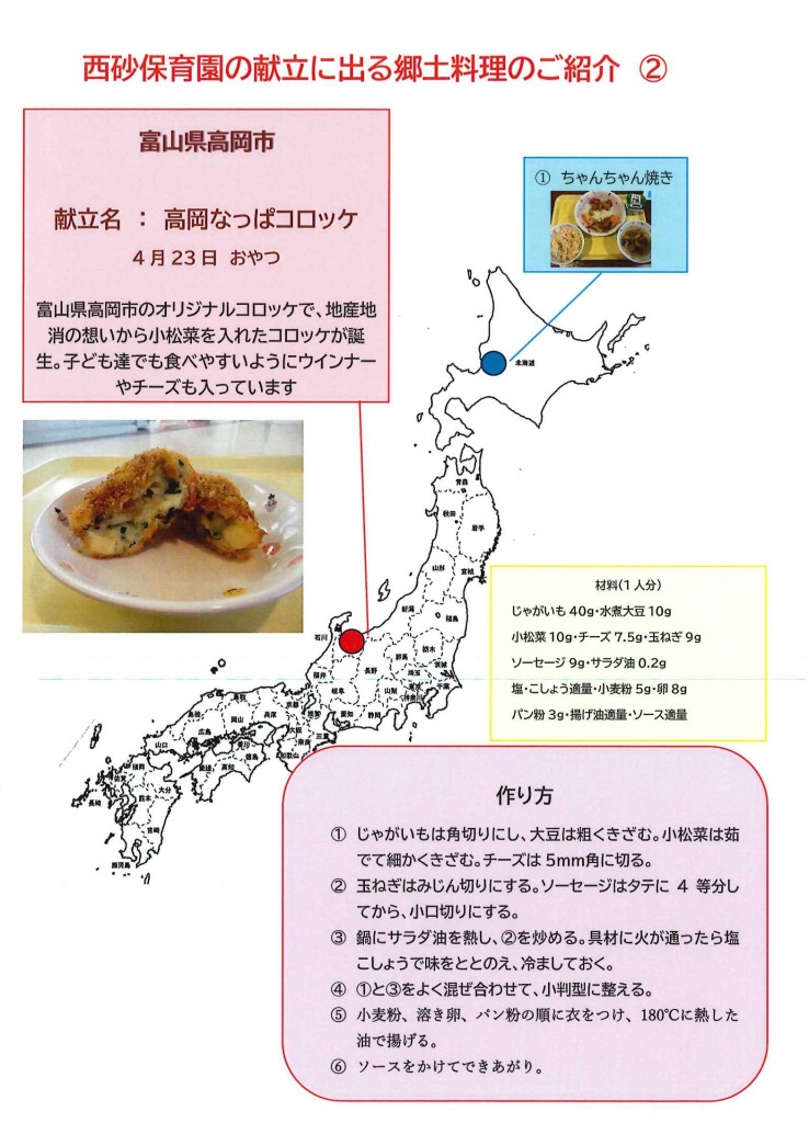 給食献立:郷土料理の紹介② 高岡なっぱコロッケにしすな保育園立川市西砂保育園社会福祉法人 高峰福祉会。