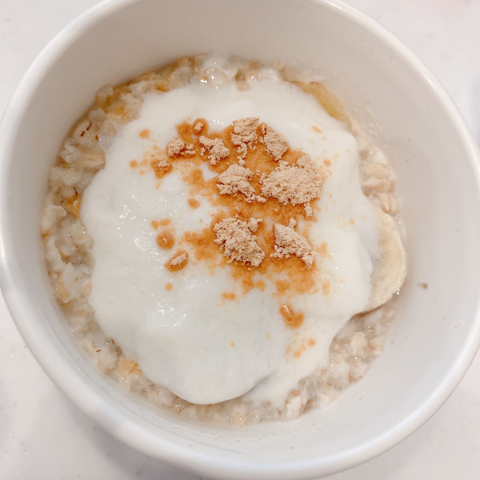 先日の私の朝食🥣 オートミール50gをたっぷりのミルク🥛入れてレンチンして、ヨーグルト、大納言かのこ、バナナ🍌、きな粉、どさんこオリゴをトッピング♡ めっちゃ美味しかったよ🎶 ぜひ♡。
