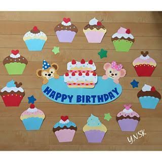 お誕生日 壁面 壁面飾り 保育 誕生日表 お誕生日おめでとう カップケーキ。