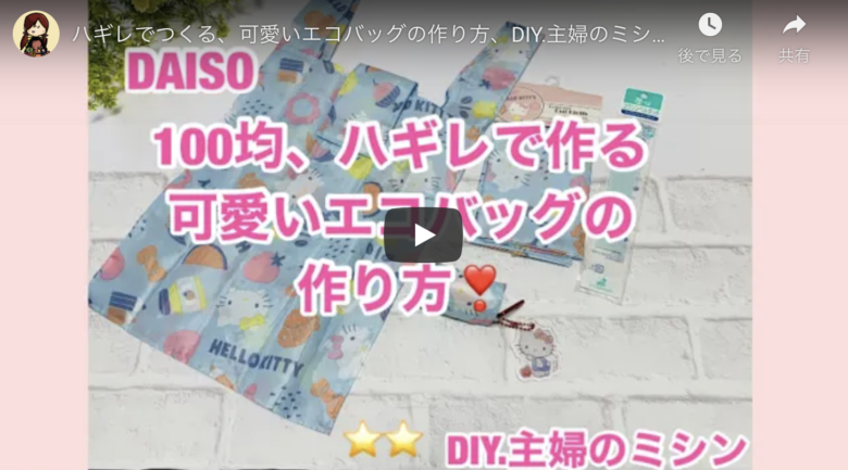 新作をYouTubeにアップしました。 簡単で可愛いエコバッグ100均diy セリアとダイソー購入品今回も低料金で簡単にできます😊ミシン初心者な私でも簡単に。