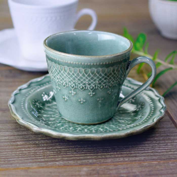 フレンチレース コーヒーカップ&ソーサー グレー 益子焼 おしゃれ マグカップ ティーカップ プレート 小皿 食洗機対応 電子レンジ使用可 ギフトプレゼント セット お家カフェ形・用途で選ぶ 益子焼の和食器,益子焼のカップ,カップ&ソーサー益子焼 わかさま陶芸。