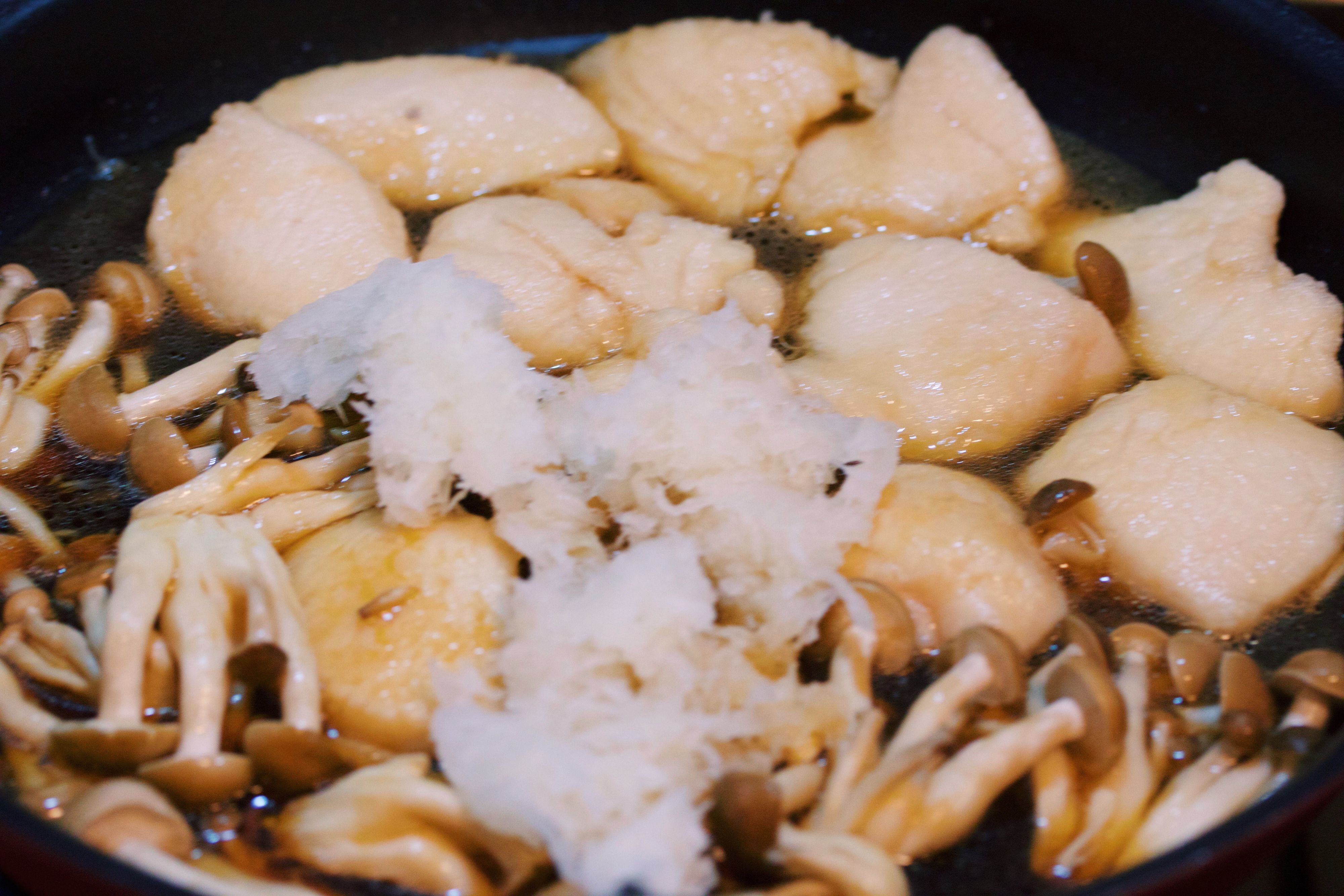 ぐっち夫婦@料理家 on X: "鶏むねに大根おろしがよく絡んでさっぱりうまい! 油揚げに染み込んだだしもジュワっとたまらん・!鶏肉のしっとり みぞれ煮鶏肉に片栗粉、ごま油で焼く。油揚げとめんつゆ、水。大根おろし、なじんだらほうれん草。盛り付けて七味。