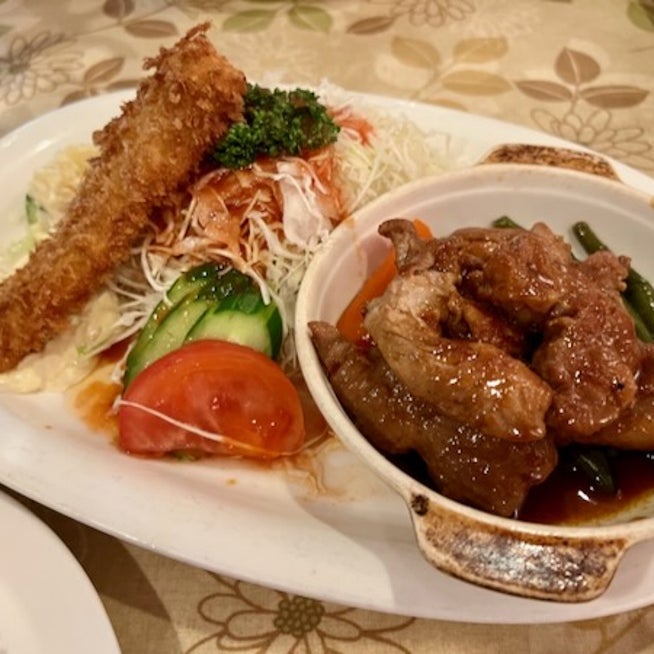 岡山中山下『オリアン』老舗洋食店のデカ盛りハンバーグと海老フライランチ。