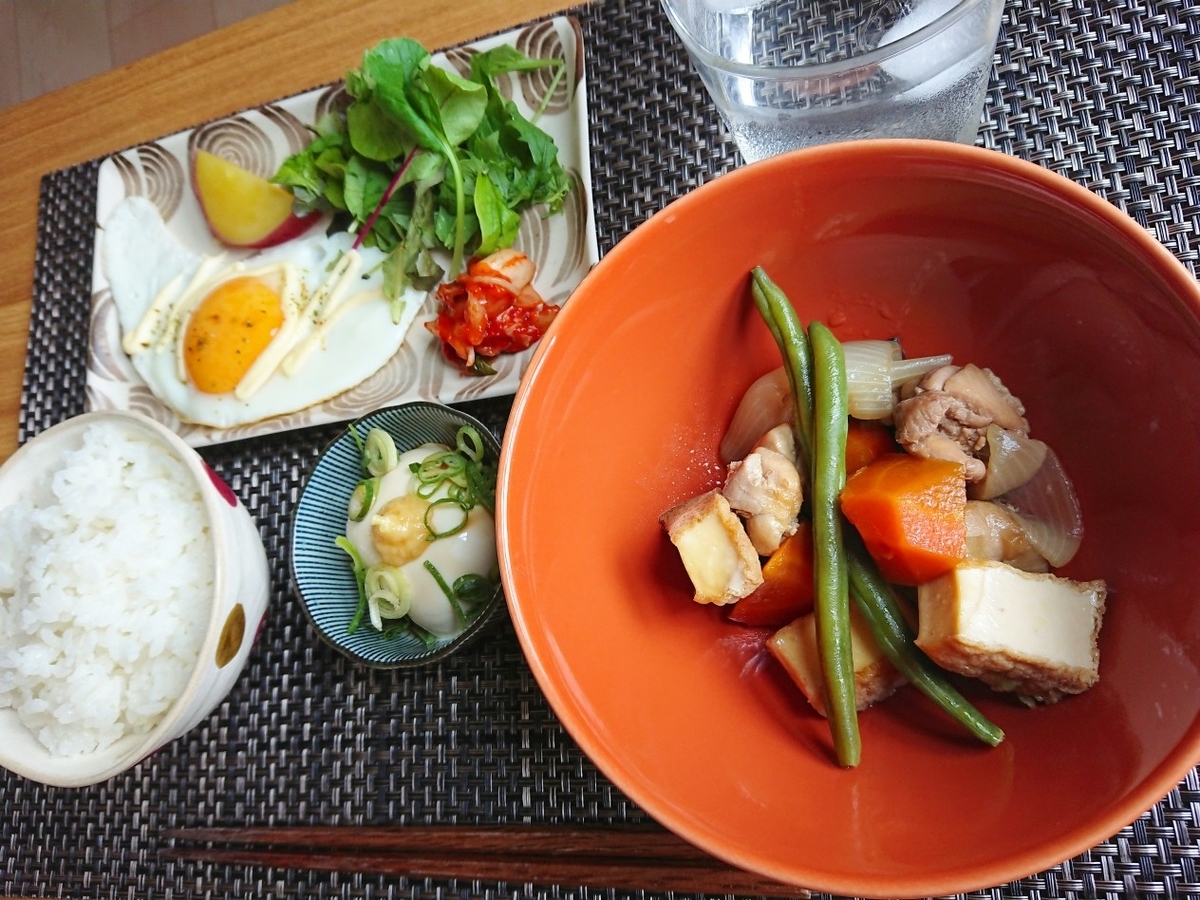 目玉焼きとウインナーの朝ごはん。 和朝食・秋の献立。