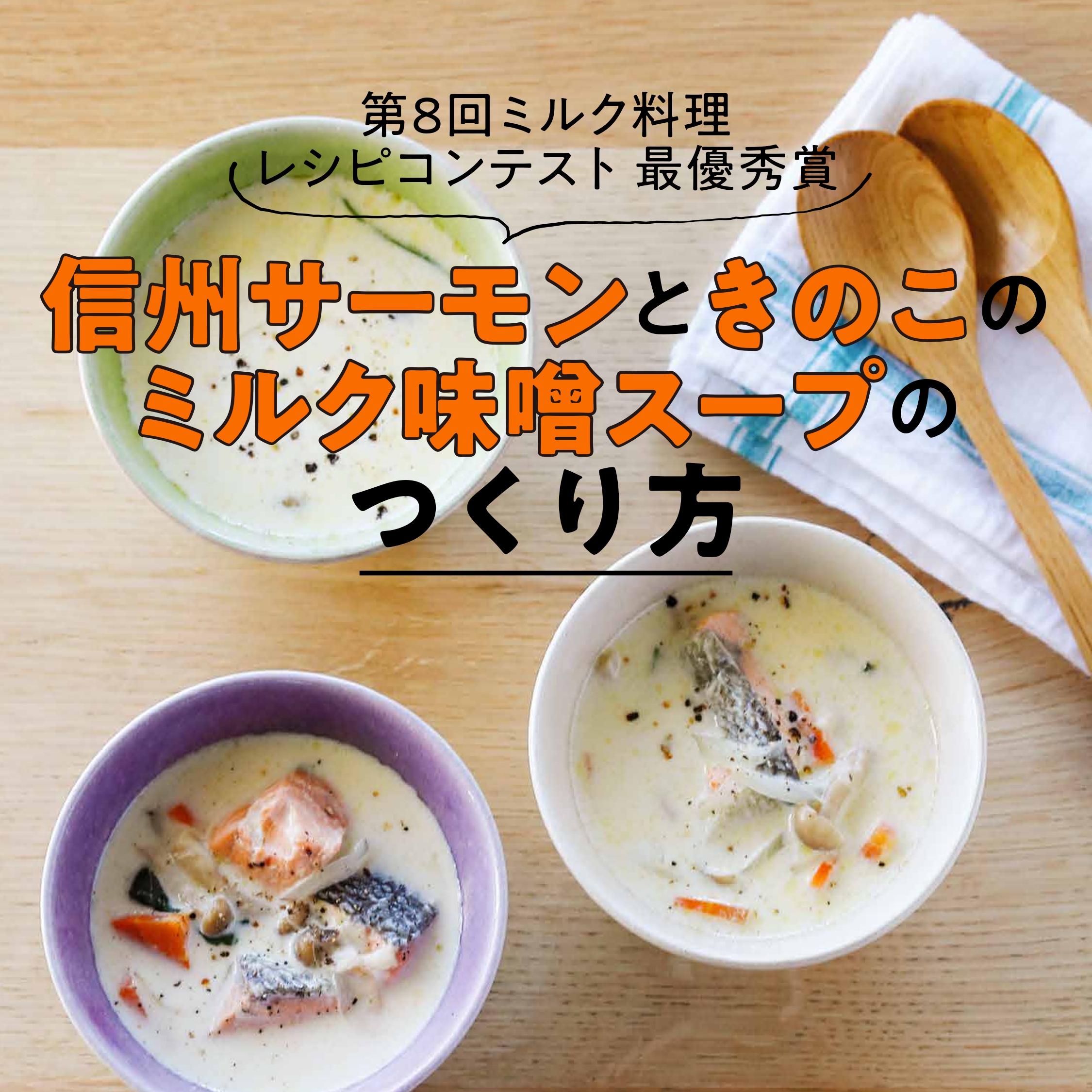 第8回ミルク料理レシピコンテスト最優秀賞 信州サーモンときのこのミルク味噌スープのつくり方~ うまいぞ!牛乳東海酪連。